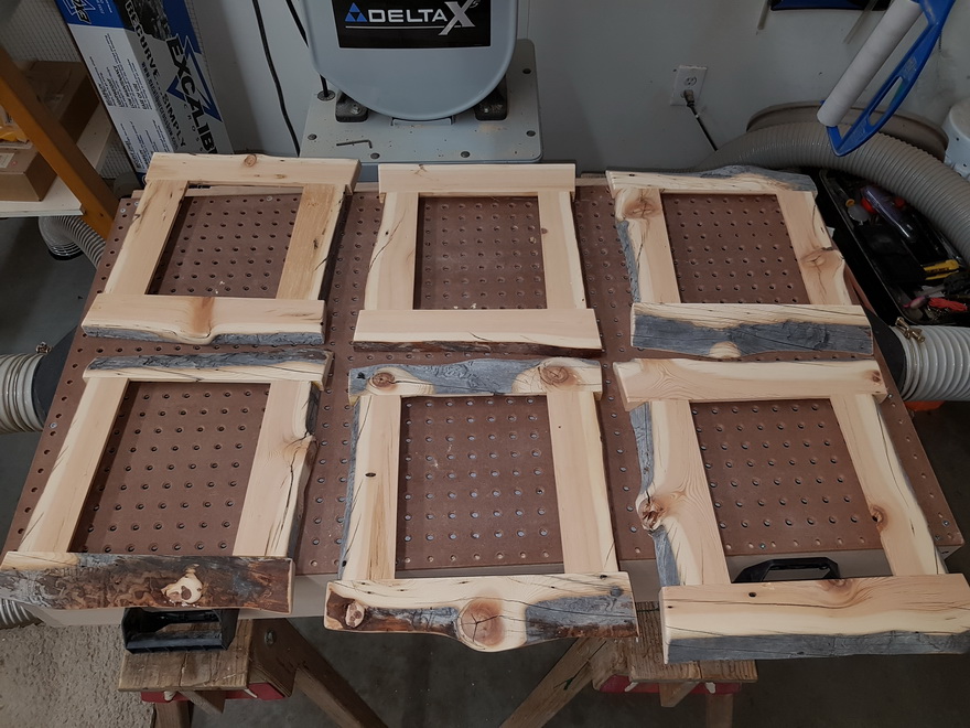 Having the website up and running has brought some very interesting people and projects to the shop. The chap holding the log brought this by to do something with; He wasn't quite sure but this log was a big part of his daughter's wedding where there is a tradition in their family that when two people get married, they use a hand cross-cut saw (one on each side) and they cut a round off the log which exemplifies life. The push and pull of a new life together until they cut through the log. I thought it was an interesting tradition so after we discussed the possibilities we decided upon live edge picture frames to place wedding photos. Nice touch I thought. Off I went to my neighbour's mill and had the wood cut into 1" thick boards. There was just enough wood to complete the 6 picture frames for the married couple and those in the wedding party. I was very enjoyable for me to be a part of such a unique project so thanks Dave for coming by.