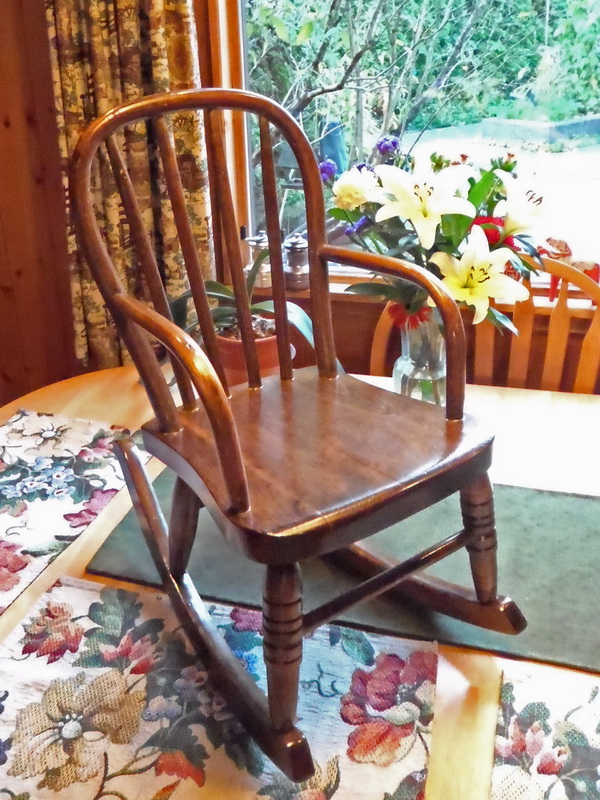 This project came to the shop in pieces as you can see. The chair is approximately 100 years old and was one of the first sitting spots for my wife's father. Originally it came completely painted white so wood identification was not possible. As this chair was built in Eastern Canada I assumed that an Eastern Maple would be a good guess so I purchased material at Lee Valley in Victoria to turn new legs. Old repairs that were done were done with nails. Not the first choice for furniture repair. After much time and utilizing several different tools, I managed to remove the nails with minimal damage to the chair. Now that all the paint was removed, Walnut was the wood the chair was constructed of. The legs were already completed so the search was on for a stain that would do the job. I found just the right product and am pleased with the final result. The time involved to complete this rebuild was well worth the time after Jane and my mother-in-law, Mary Jane saw the final piece. For years this chair sat in pieces and now it has a new start again for our grandchildren. As my grand-daughter Riley says "Goodjob!"